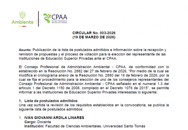 CIRCULAR No. 003-2026 (19 DE MARZO DE 2026) Asunto: Publicación de la lista de postulados admitidos e información sobre la recepción y remisión de propuestas y el proceso de votación para la elección del representante de las Instituciones de Educación Superior Privadas ante el CPAA....