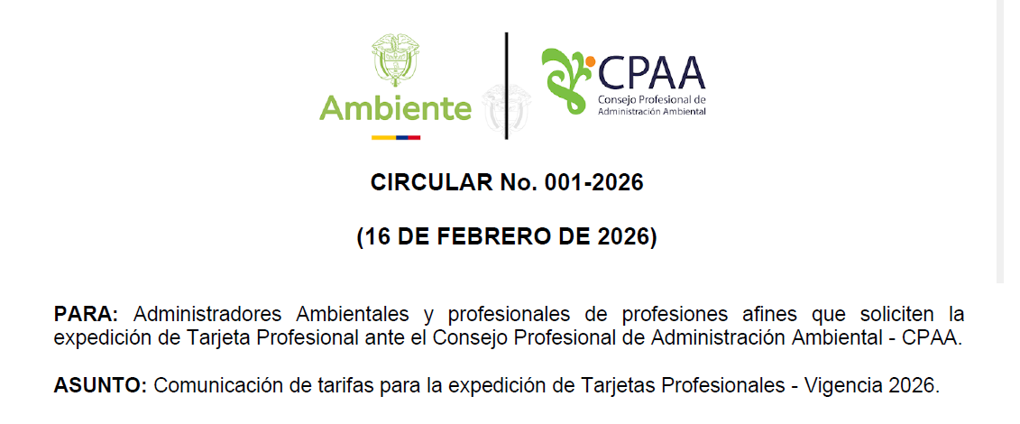 Noticias Publicaciones Feb 16 2026 CIRCULAR No. 001-2026 (16 DE FEBRERO DE 2026)2026. CIRCULAR 001 DE 2026 – TARIFAS EXPEDICION TARJETA PROFESIONAL Administrador CPAA 0 Comentarios